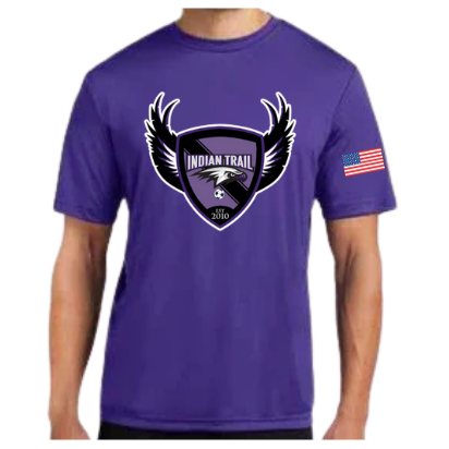This soft, 100% polyester short sleeve loose fitting drifit is perfect for supporting your favorite Hawk! You'll stand out in the crowd with this purple t-shirt in support of the IT Hawks! Item comes with full front winged IT soccer logo, flag on left sleeve, HAWKS on the back. No shrinking with this one!